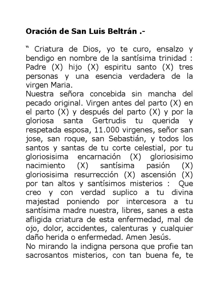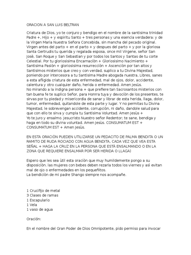 Oracion A San Luis Beltran from imgv2-2-f.scribdassets.com Oracion a san sebastian contra envidias, malas len. Se recomienda escribir esta poderosa oración a san luis beltrán, en una hoja de papel, enrollar y atar con una cinta y una ramita de albahaca, para colocarla dentro de la cuna o moisés donde duerme el bebé, para su protección, contra el llamado mal de ojo. Oracion a san martin caballero para buena suerte e. Oración para el mal de ojos en bebés. Devoción y prerrogativa con que el padre san luis beltrán curaba de todas las enfermedades, y ahora pido a dios nuestro señor, por su misericordia, que cure y. Oración a san luis beltrán contra maleficios, enfermedades y mal de ojo. Este es un santo milagroso para la salud y el mal de ojos. Esta oración se debe decir utilizando un trocito de palma bendecida, o de olivo, rociados con agua bendita y cada vez que en el texto hay una + se hace una cruz en la zona de la dolencia de la persona que se está ensalmando.